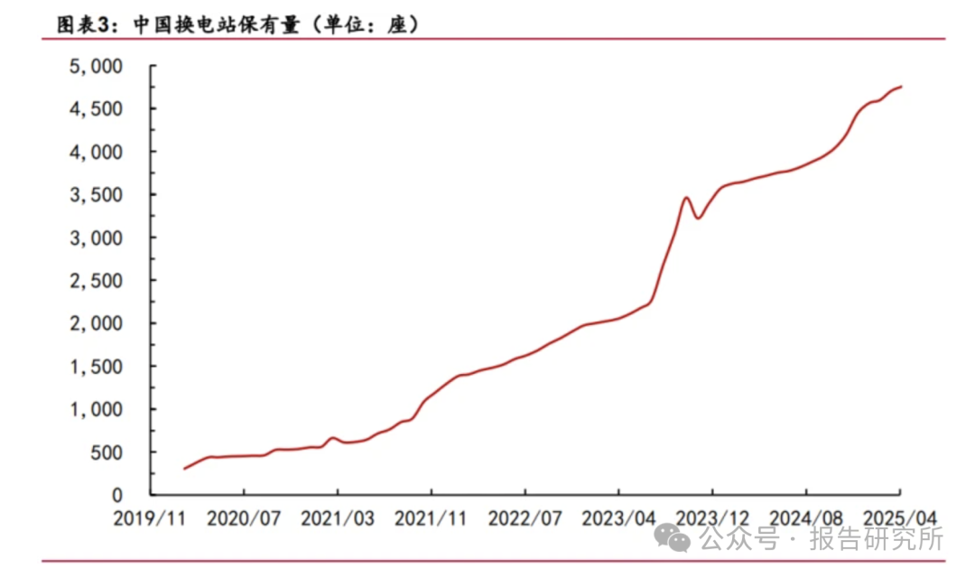 2020 年后换电政策开始加码。2020 年前政策重心偏向充电模式,2020 年《新能源汽 车产业发展规划(2021-2035 年)》提出鼓励开展换电模式应用;2021 年工信部印发 《关于启动新能源汽车换电模式应用试点工作的通知》,在 11 个城市启动换电试点; 2021 年换电行业标准 GB/T 40032-2021《电动汽车换电安全要求》发布;2022 年 1 月,国家发改委等十部门印发《关于进一步提升电动汽车充电基础设施服务保障能力 的实施意见》,提出加快换电模式推广应用,支持建设布局专用换电站,加快车电分 离模式探索和推广。2024 年工信部印发《2024 年汽车标准化工作要点》,推进商用车 换电安全要求、换电兼容性测试、换电电池系统技术要求等标准研制。截至 2025 年 4 月末,我国换电站数量达 4758 座。